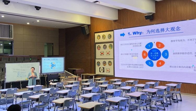 最后,長壽區(qū)英語教研員任莉娜老師作了《關(guān)于大觀念統(tǒng)領(lǐng)下單元整體教學(xué)的解讀》的專題講座。她從Why-為何選擇大觀念,What-何為英語學(xué)科大觀念,How-如何基于大觀念教學(xué)設(shè)計三個方面具體地剖析了大單元教學(xué)環(huán)境下的教學(xué)思路,技能策略以及幫助學(xué)生認知結(jié)構(gòu)的建構(gòu),情感態(tài)度的培養(yǎng)等。