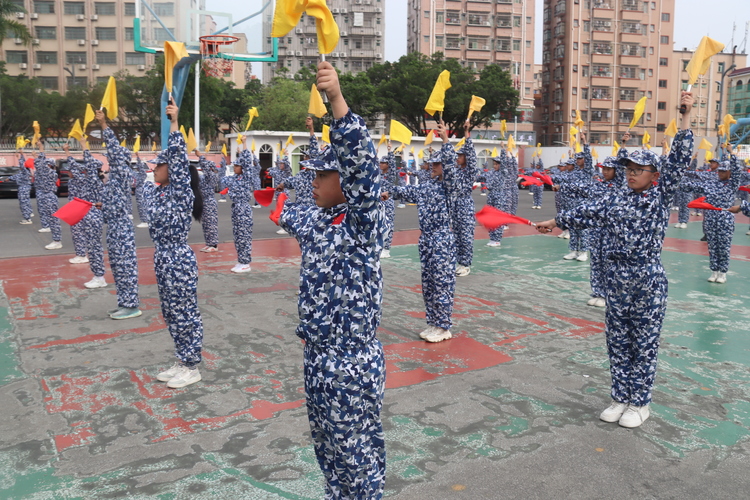 隨著音樂響起,同學(xué)們雙手拿旗,紅色和黃色的小旗,在同學(xué)們的手中翩翩起舞。舞出的海軍旗語操以其整齊劃一的動作、虎虎生威的氣勢、團(tuán)結(jié)協(xié)作的精神,熟練地用揮旗動作打出“無聲語言”。